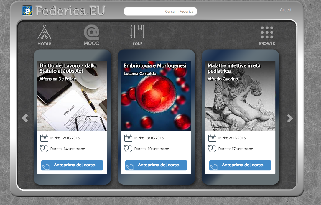 Abbiamo effettuato delle attività di UX research sul sito di e-learning dell’Università “Federico II” di Napoli andando a definire le principali efficienze, gli elementi di criticità e indicando le soluzioni migliorative da considerare in fase di concezione e realizzazione del portale di nuova generazione: