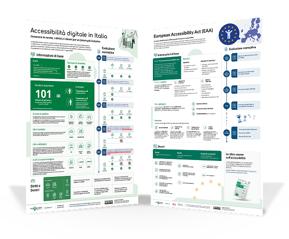 Le infografiche ti offrono una visione completa e semplificata del panorama normativo italiano ed europeo, aiutandoti a comprendere obblighi e opportunità legate all’accessibilità digitale.